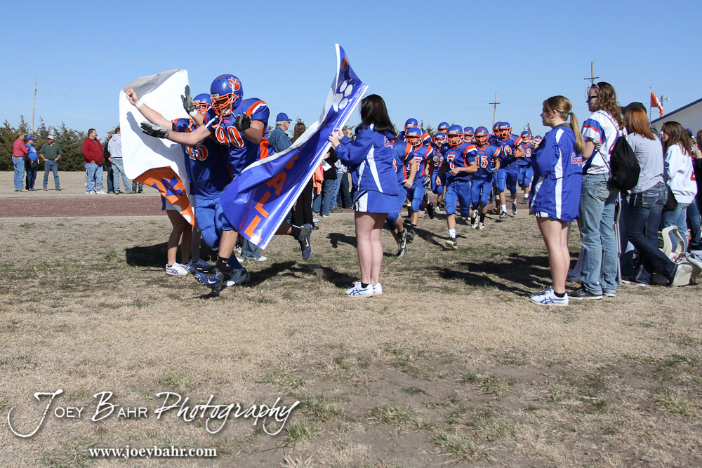 Otis-Bison Cougars Tyler Maier (#90) and Samuel Higgason (#45) break through a banner before the Thunder Ridge at Otis-Bison KSHSAA Eight Man Division II Regional Game with Thunder Ridge winning 28-18 at Otis-Bison High School in Otis, Kansas on November 3, 2012. (Photo: Joey Bahr, www.joeybahr.com)