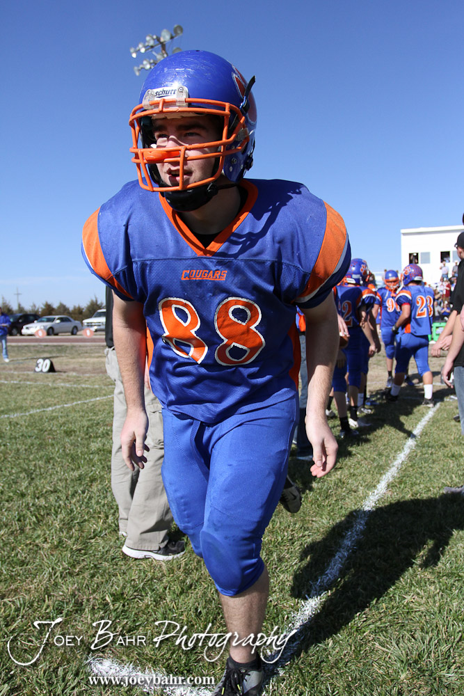 Otis-Bison Cougar Matthew Demel (#88) runs out onto the field before the Thunder Ridge at Otis-Bison KSHSAA Eight Man Division II Regional Game with Thunder Ridge winning 28-18 at Otis-Bison High School in Otis, Kansas on November 3, 2012. (Photo: Joey Bahr, www.joeybahr.com)