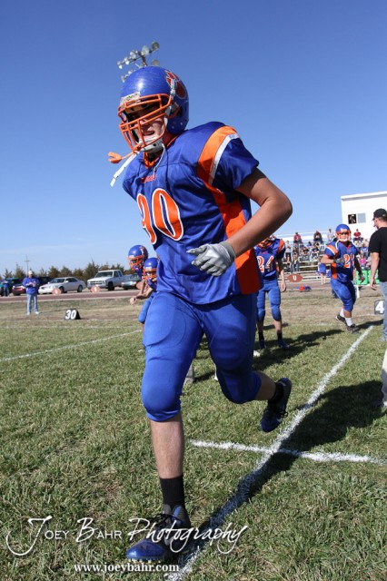 Otis-Bison Cougar Tyler Maier (#90) runs out onto the field before the Thunder Ridge at Otis-Bison KSHSAA Eight Man Division II Regional Game with Thunder Ridge winning 28-18 at Otis-Bison High School in Otis, Kansas on November 3, 2012. (Photo: Joey Bahr, www.joeybahr.com)