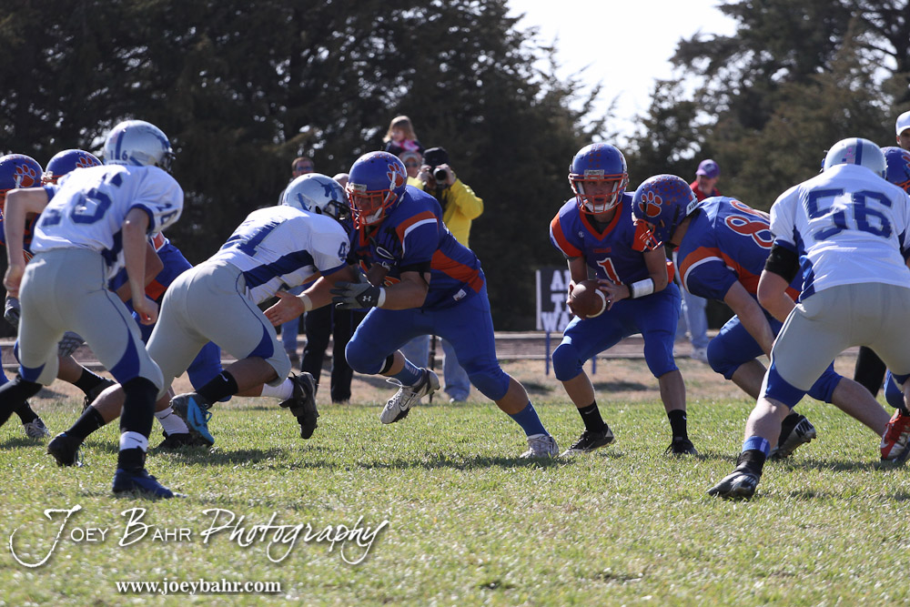 Otis-Bison Cougar Kole Urban (#1) hands off the ball during the Thunder Ridge at Otis-Bison KSHSAA Eight Man Division II Regional Game with Thunder Ridge winning 28-18 at Otis-Bison High School in Otis, Kansas on November 3, 2012. (Photo: Joey Bahr, www.joeybahr.com)