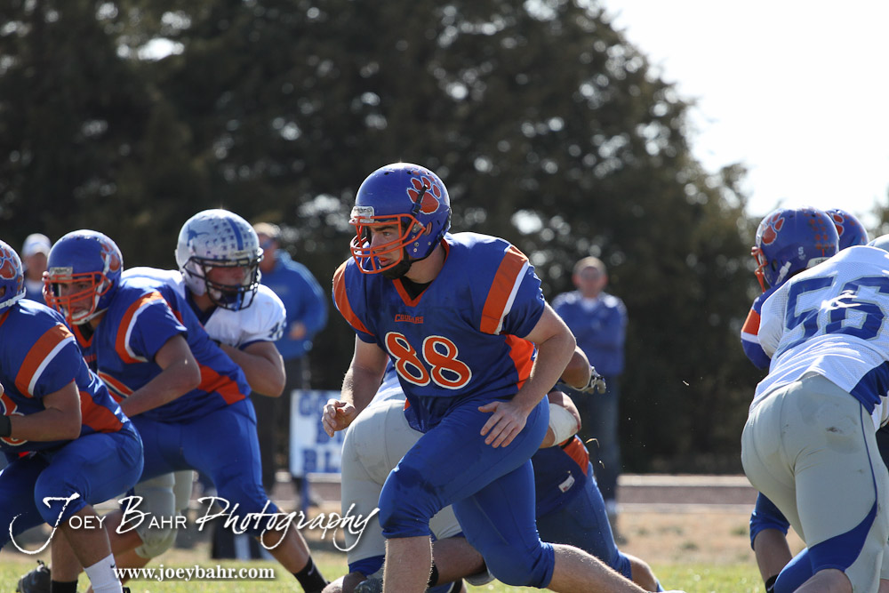 Otis-Bison Cougar Matthew Demel (#88) looks for the ball carrier during the Thunder Ridge at Otis-Bison KSHSAA Eight Man Division II Regional Game with Thunder Ridge winning 28-18 at Otis-Bison High School in Otis, Kansas on November 3, 2012. (Photo: Joey Bahr, www.joeybahr.com)