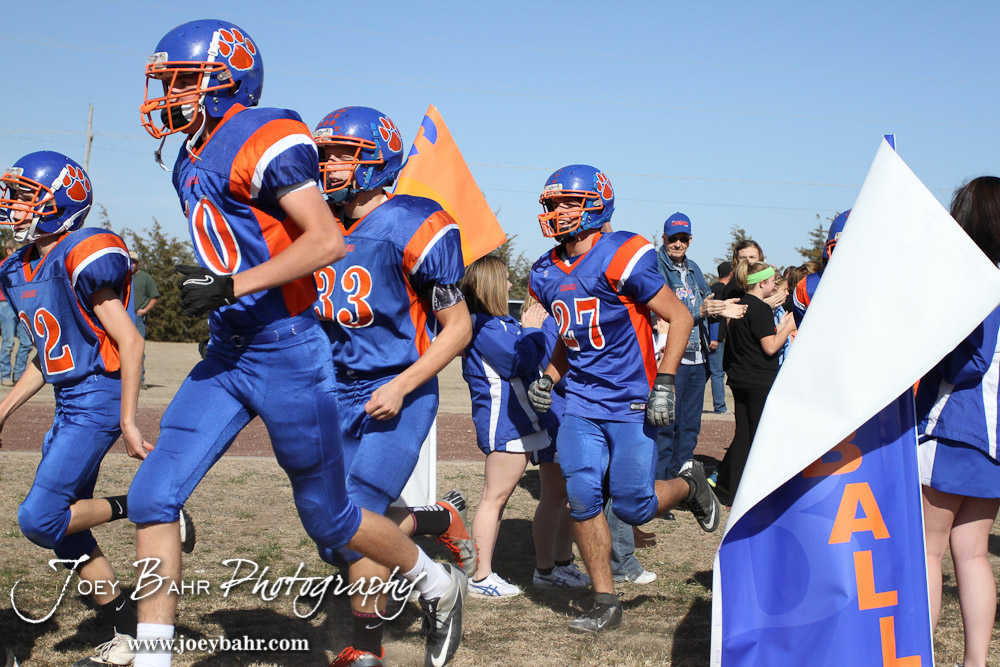 Members of the Otis-Bison Cougars run through a banner before the Thunder Ridge at Otis-Bison KSHSAA Eight Man Division II Regional Game with Thunder Ridge winning 28-18 at Otis-Bison High School in Otis, Kansas on November 3, 2012. (Photo: Joey Bahr, www.joeybahr.com)