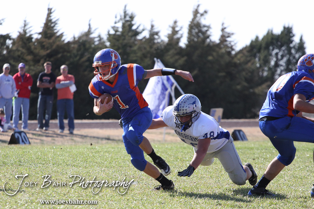 Otis-Bison Cougar Kole Urban (#1) runs out from the grasp of Thunder Ridge Longhorn Benton Hrabe (#48) during the Thunder Ridge at Otis-Bison KSHSAA Eight Man Division II Regional Game with Thunder Ridge winning 28-18 at Otis-Bison High School in Otis, Kansas on November 3, 2012. (Photo: Joey Bahr, www.joeybahr.com)
