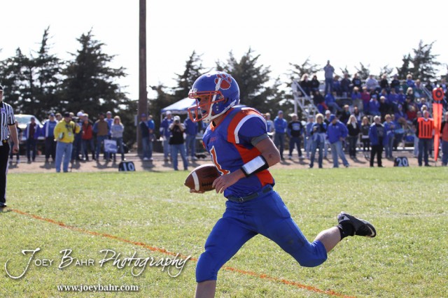 Otis-Bison Cougar Kole Urban (#1) scores a touchdown during the Thunder Ridge at Otis-Bison KSHSAA Eight Man Division II Regional Game with Thunder Ridge winning 28-18 at Otis-Bison High School in Otis, Kansas on November 3, 2012. (Photo: Joey Bahr, www.joeybahr.com)