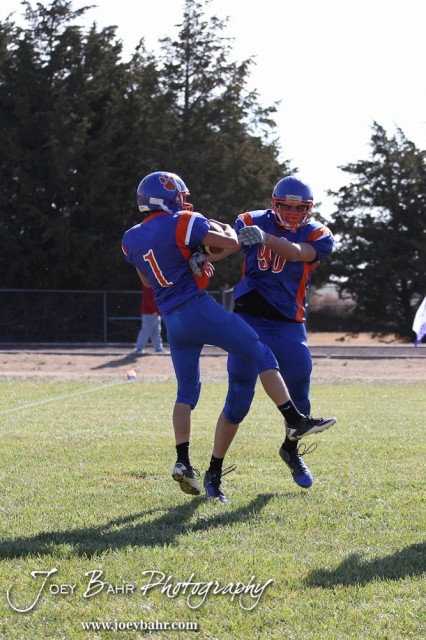 Otis-Bison Cougars Kole Urban (#1) and Tyler Maier (#90) celebrate Urban’s touchdown during the Thunder Ridge at Otis-Bison KSHSAA Eight Man Division II Regional Game with Thunder Ridge winning 28-18 at Otis-Bison High School in Otis, Kansas on November 3, 2012. (Photo: Joey Bahr, www.joeybahr.com)