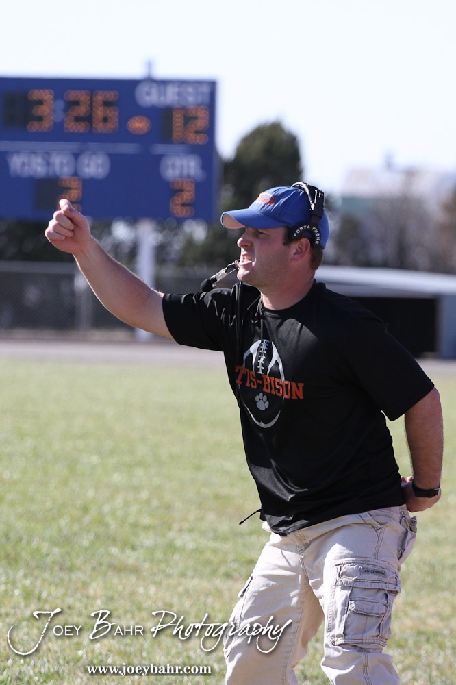 Otis-Bison Cougar Head Coach Travis Starr signals in a play during the Thunder Ridge at Otis-Bison KSHSAA Eight Man Division II Regional Game with Thunder Ridge winning 28-18 at Otis-Bison High School in Otis, Kansas on November 3, 2012. (Photo: Joey Bahr, www.joeybahr.com)