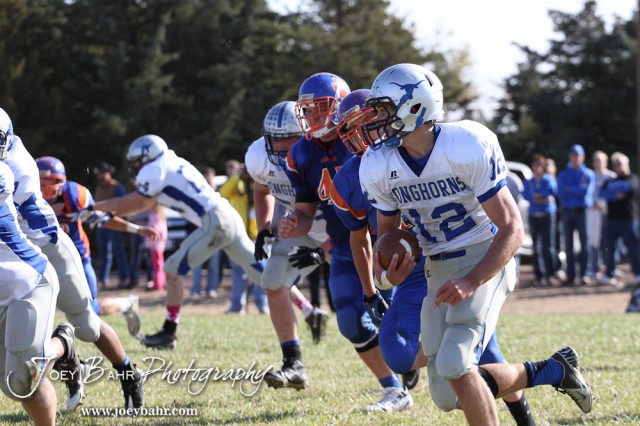 Thunder Ridge Longhorn Trevor Lowe (#12) carries the ball during the Thunder Ridge at Otis-Bison KSHSAA Eight Man Division II Regional Game with Thunder Ridge winning 28-18 at Otis-Bison High School in Otis, Kansas on November 3, 2012. (Photo: Joey Bahr, www.joeybahr.com)