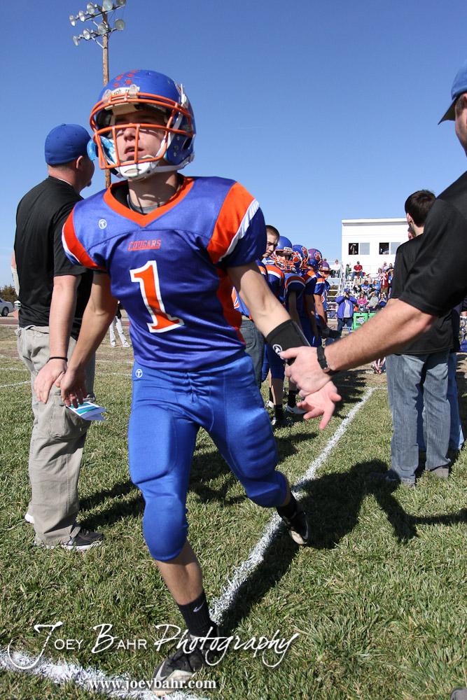 Otis-Bison Cougar Kole Urban (#1) runs out onto the field before the Thunder Ridge at Otis-Bison KSHSAA Eight Man Division II Regional Game with Thunder Ridge winning 28-18 at Otis-Bison High School in Otis, Kansas on November 3, 2012. (Photo: Joey Bahr, www.joeybahr.com)