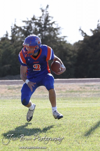 Otis-Bison Cougar Dylan Wissman (#2) looks for a hole to run through during the Thunder Ridge at Otis-Bison KSHSAA Eight Man Division II Regional Game with Thunder Ridge winning 28-18 at Otis-Bison High School in Otis, Kansas on November 3, 2012. (Photo: Joey Bahr, www.joeybahr.com)