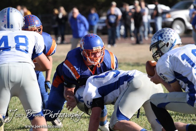 Thunder Ridge Longhorn Kade Dennis (#56) blocks Otis-Bison Cougar Samuel Higgason (#45) during the Thunder Ridge at Otis-Bison KSHSAA Eight Man Division II Regional Game with Thunder Ridge winning 28-18 at Otis-Bison High School in Otis, Kansas on November 3, 2012. (Photo: Joey Bahr, www.joeybahr.com)