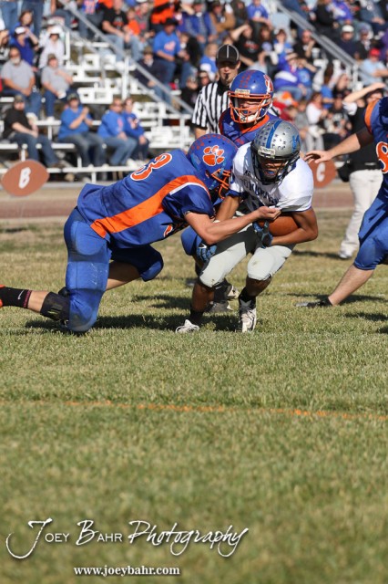Otis-Bison Cougar Jordan Hoffman (#33) tackles Thunder Ridge Longhorn Trent Rietzke (#30) during the Thunder Ridge at Otis-Bison KSHSAA Eight Man Division II Regional Game with Thunder Ridge winning 28-18 at Otis-Bison High School in Otis, Kansas on November 3, 2012. (Photo: Joey Bahr, www.joeybahr.com)