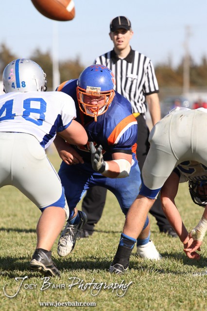 Otis-Bison Cougar Samuel Higgason (#45) tries to shoot though a hole in the Thunder Ridge Longhorn Offensive Line during the Thunder Ridge at Otis-Bison KSHSAA Eight Man Division II Regional Game with Thunder Ridge winning 28-18 at Otis-Bison High School in Otis, Kansas on November 3, 2012. (Photo: Joey Bahr, www.joeybahr.com)