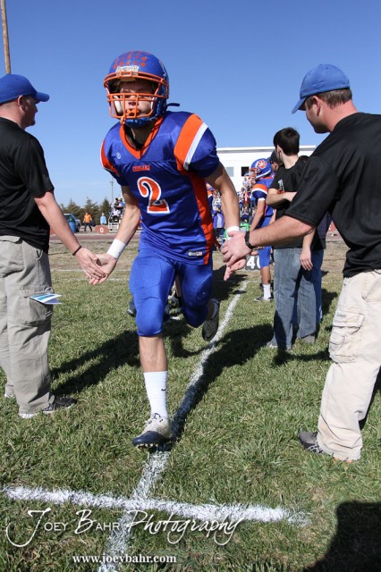 Otis-Bison Cougar Dylan Wissman (#2) runs out onto the field before the Thunder Ridge at Otis-Bison KSHSAA Eight Man Division II Regional Game with Thunder Ridge winning 28-18 at Otis-Bison High School in Otis, Kansas on November 3, 2012. (Photo: Joey Bahr, www.joeybahr.com)