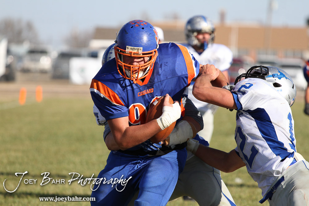 Otis-Bison Cougar Tyler Maier (#90) fights through the tackle of Thunder Ridge Longhorns Larame Boyle (#27) and Trevor Lowe (#12) try to tackle him during the Thunder Ridge at Otis-Bison KSHSAA Eight Man Division II Regional Game with Thunder Ridge winning 28-18 at Otis-Bison High School in Otis, Kansas on November 3, 2012. (Photo: Joey Bahr, www.joeybahr.com)