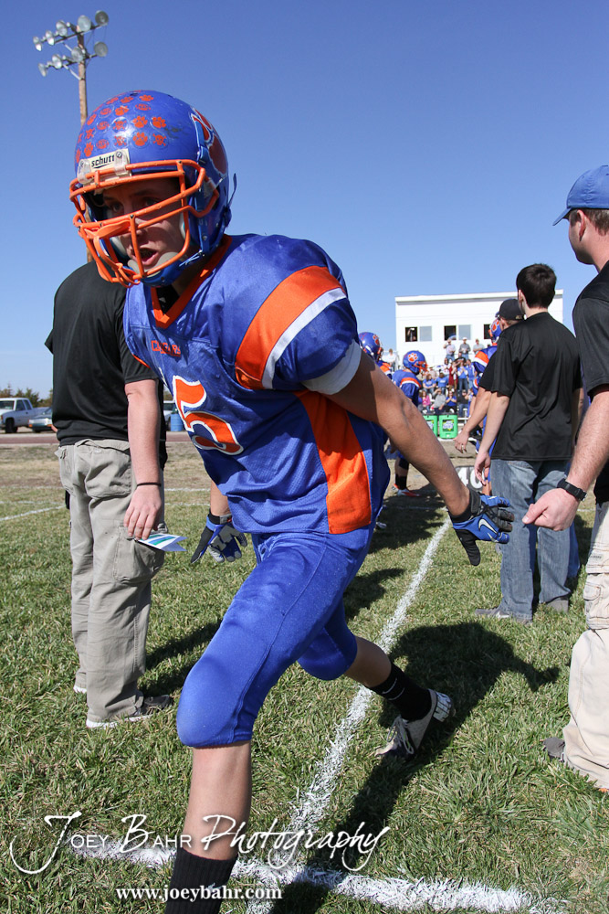 Otis-Bison Cougar Justus Bartonek (#15) runs out onto the field before the Thunder Ridge at Otis-Bison KSHSAA Eight Man Division II Regional Game with Thunder Ridge winning 28-18 at Otis-Bison High School in Otis, Kansas on November 3, 2012. (Photo: Joey Bahr, www.joeybahr.com)