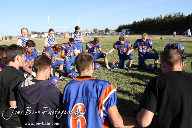 The Otis-Bison Cougars kneel to pray following the Thunder Ridge at Otis-Bison KSHSAA Eight Man Division II Regional Game with Thunder Ridge winning 28-18 at Otis-Bison High School in Otis, Kansas on November 3, 2012. (Photo: Joey Bahr, www.joeybahr.com)