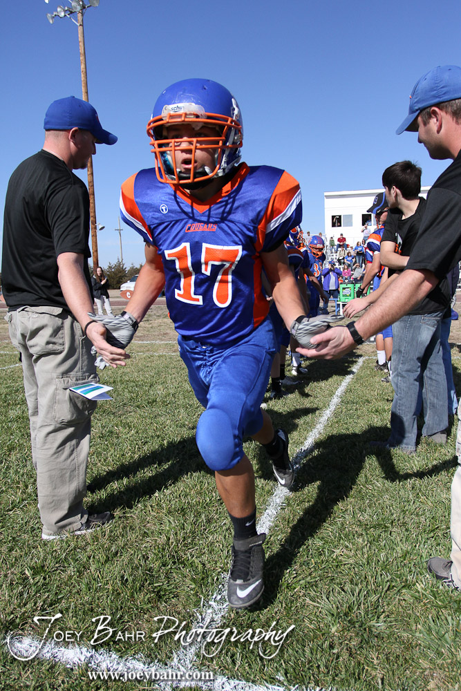 Otis-Bison Cougar Justin Jecha (#17) runs out onto the field before the Thunder Ridge at Otis-Bison KSHSAA Eight Man Division II Regional Game with Thunder Ridge winning 28-18 at Otis-Bison High School in Otis, Kansas on November 3, 2012. (Photo: Joey Bahr, www.joeybahr.com)