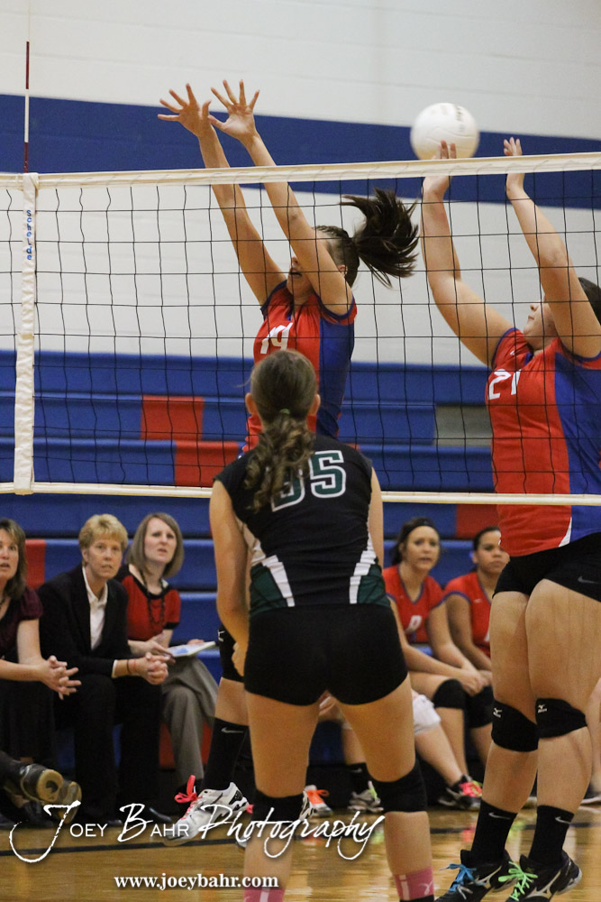 Ellinwood Lady Eagles Devann Patten (#14) and Kelsea Ward (#27) set a wall during the Central Plains Lady Oilers at Ellinwood Lady Eagles volleyball match at Ellinwood High School in Ellinwood, Kansas on October 11, 2012. (Photo: Joey Bahr, www.joeybahr.com)