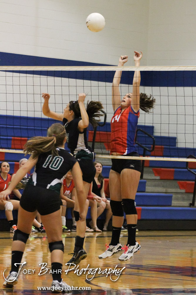 Ellinwood Lady Eagle Devann Patten (#14) reaches to block a shot from Central Plains Lady Oiler Taylor Rolfs (#14) during the Central Plains Lady Oilers at Ellinwood Lady Eagles volleyball match at Ellinwood High School in Ellinwood, Kansas on October 11, 2012. (Photo: Joey Bahr, www.joeybahr.com)