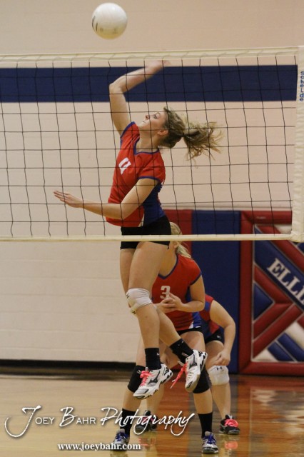 Ellinwood Lady Eagle Lindsey Zink (#4) goes for a kill during the Central Plains Lady Oilers at Ellinwood Lady Eagles volleyball match at Ellinwood High School in Ellinwood, Kansas on October 11, 2012. (Photo: Joey Bahr, www.joeybahr.com)