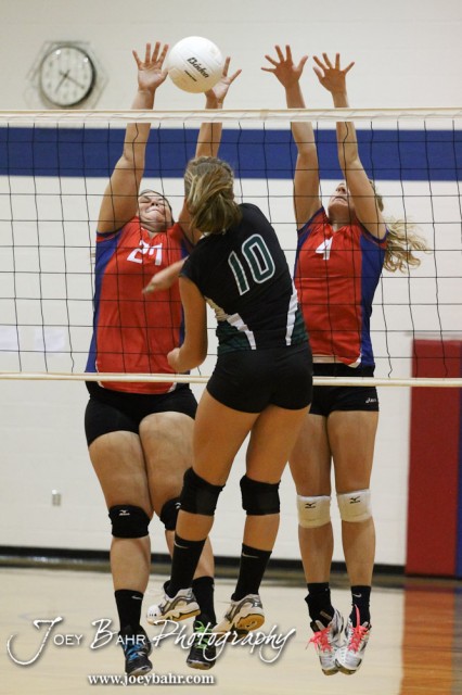 Ellinwood Lady Eagles Kelsea Ward (#27) and Lindsey Zink (#4) block a shot from Central Plains Lady Oiler Breanna Holmes (#10) during the Central Plains Lady Oilers at Ellinwood Lady Eagles volleyball match at Ellinwood High School in Ellinwood, Kansas on October 11, 2012. (Photo: Joey Bahr, www.joeybahr.com)