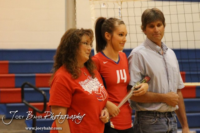 Ellinwood Lady Eagle Devann Patten (#14) is introduced with her parents before the Central Plains Lady Oilers at Ellinwood Lady Eagles volleyball match at Ellinwood High School in Ellinwood, Kansas on October 11, 2012. (Photo: Joey Bahr, www.joeybahr.com)
