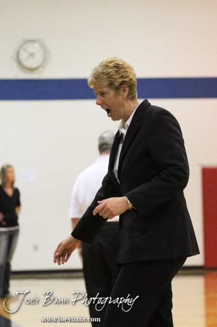 Ellinwood Lady Eagle Head Coach Laurie Feist celebrates winning a game during the Central Plains Lady Oilers at Ellinwood Lady Eagles volleyball match at Ellinwood High School in Ellinwood, Kansas on October 11, 2012. (Photo: Joey Bahr, www.joeybahr.com)