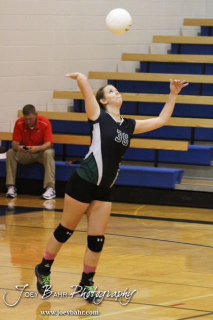 Central Plains Lady Oiler Jennifer Hitschmann (#35) serves during the Central Plains Lady Oilers at Ellinwood Lady Eagles volleyball match at Ellinwood High School in Ellinwood, Kansas on October 11, 2012. (Photo: Joey Bahr, www.joeybahr.com)