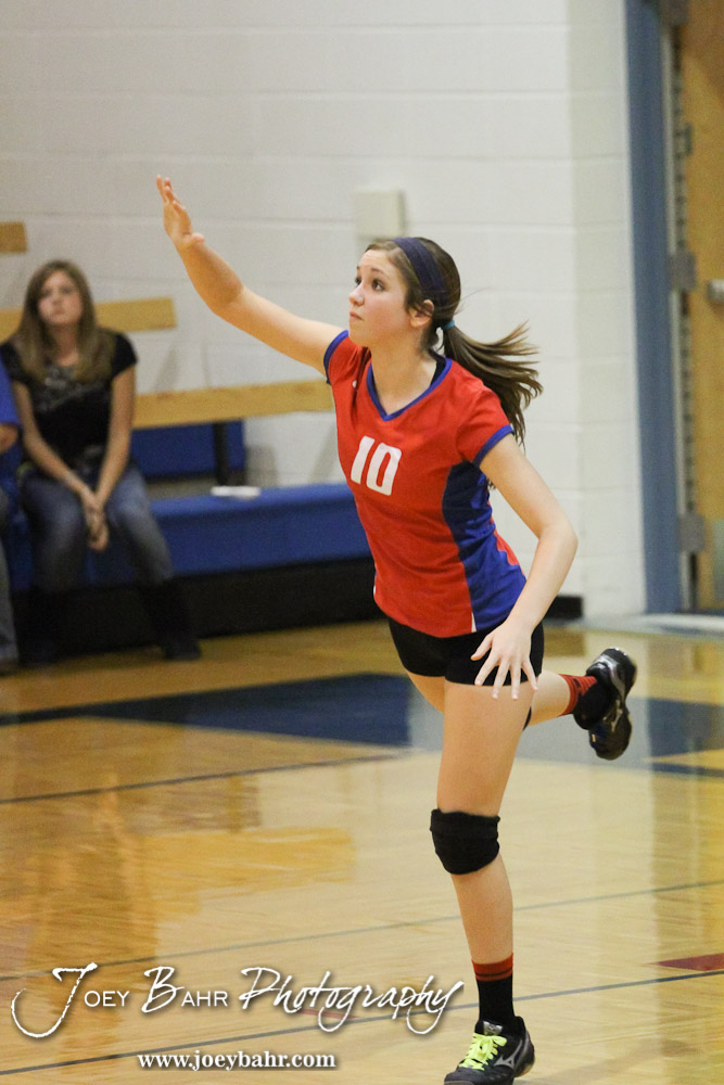 Ellinwood Lady Eagle Becca Parke (#10) serves during the Central Plains Lady Oilers at Ellinwood Lady Eagles volleyball match at Ellinwood High School in Ellinwood, Kansas on October 11, 2012. (Photo: Joey Bahr, www.joeybahr.com)