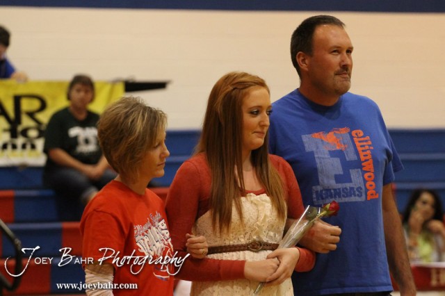Ellinwood Lady Eagle Kaitlyn Wondra (#25) is introduced with her parents before the Central Plains Lady Oilers at Ellinwood Lady Eagles volleyball match at Ellinwood High School in Ellinwood, Kansas on October 11, 2012. (Photo: Joey Bahr, www.joeybahr.com)