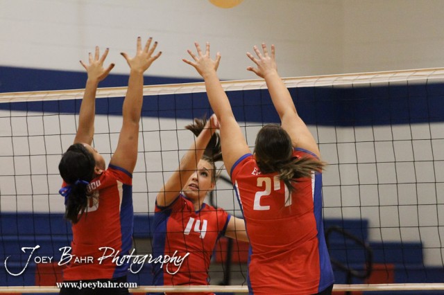 Ellinwood Lady Eagles Devann Patten (#14), Cassidy Schlessiger (#20), and Kelsea Ward (#27) warmup for the Central Plains Lady Oilers at Ellinwood Lady Eagles volleyball match at Ellinwood High School in Ellinwood, Kansas on October 11, 2012. (Photo: Joey Bahr, www.joeybahr.com)