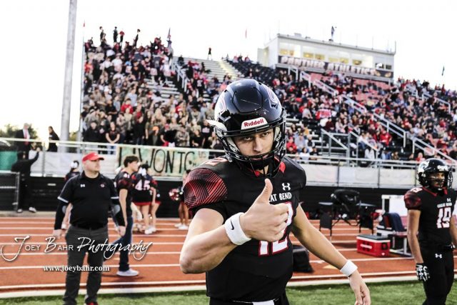 Great Bend Panther #12 Koy Brack signals he is ready to get the game started. The Great Bend Panthers defeated the Garden City Buffaloes 49 to 6 at Memorial Stadium in Great Bend, Kansas on October 19, 2018. (Photo: Joey Bahr, www.joeybahr.com)undefined