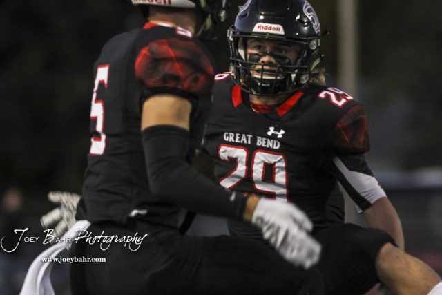Great Bend Panthers #29 Gage Fritz and #5 Brock Blessing celebrate Fitz’s touchdown in the first quarter. The Great Bend Panthers defeated the Garden City Buffaloes 49 to 6 at Memorial Stadium in Great Bend, Kansas on October 19, 2018. (Photo: Joey Bahr, www.joeybahr.com)undefined