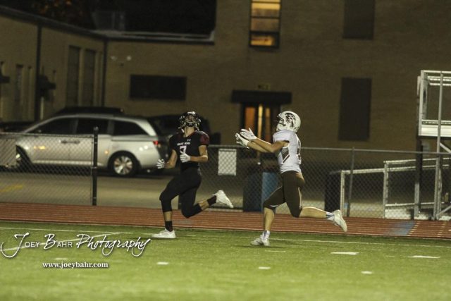 Great Bend Panther #7 Calan Haberman looks back for the pass as Garden City Buffalo #2 Joel Bellows defends in the first quarter. The Great Bend Panthers defeated the Garden City Buffaloes 49 to 6 at Memorial Stadium in Great Bend, Kansas on October 19, 2018. (Photo: Joey Bahr, www.joeybahr.com)undefined