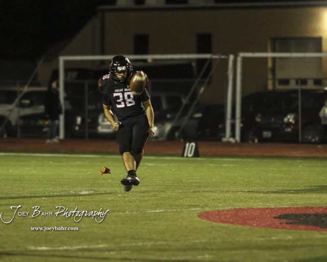 Great Bend Panther #38 Dani Franco kicks the ball off after a touchdown. The Great Bend Panthers defeated the Garden City Buffaloes 49 to 6 at Memorial Stadium in Great Bend, Kansas on October 19, 2018. (Photo: Joey Bahr, www.joeybahr.com)undefined