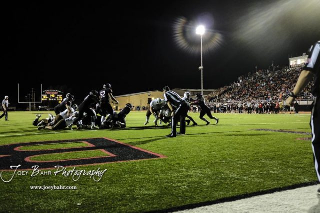 Garden City Buffalo #34 Reece Morss crosses the plane and scores a touchdown in the fourth quarter. The Great Bend Panthers defeated the Garden City Buffaloes 49 to 6 at Memorial Stadium in Great Bend, Kansas on October 19, 2018. (Photo: Joey Bahr, www.joeybahr.com)undefined