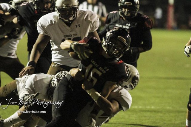 Great Bend Panther #16 Dalton Miller reaches out for more yards as he is tackled. The Great Bend Panthers defeated the Garden City Buffaloes 49 to 6 at Memorial Stadium in Great Bend, Kansas on October 19, 2018. (Photo: Joey Bahr, www.joeybahr.com)undefined