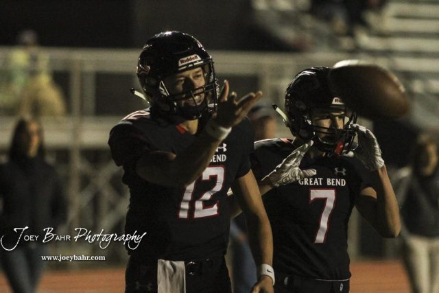 Great Bend Panther #12 Koy Brack tosses the ball to an official after scoring a touchdown in the fourth quarter. The Great Bend Panthers defeated the Garden City Buffaloes 49 to 6 at Memorial Stadium in Great Bend, Kansas on October 19, 2018. (Photo: Joey Bahr, www.joeybahr.com)undefined