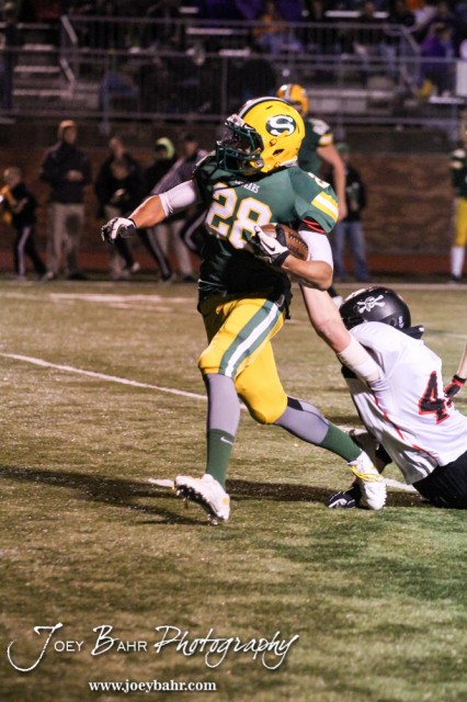 Great Bend Panther Wyatt Bryant (#44 ) grabs the back of Salina South Cougar Mike Jones’s (#28) jersey during the Great Bend versus Salina South High School football game with Salina South winning 56 to 13 at Salina Stadium in Salina, Kansas on November 1, 2013. (Photo: Joey Bahr, www.joeybahr.com)