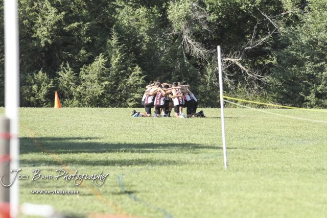 The Hays boys varsity Cross Country team huddles before the start of their race. The Great Bend Cross Country Invitational was held at Lake Barton near Great Bend, Kansas on August 30, 2018. (Photo: Joey Bahr, www.joeybahr.com)undefined