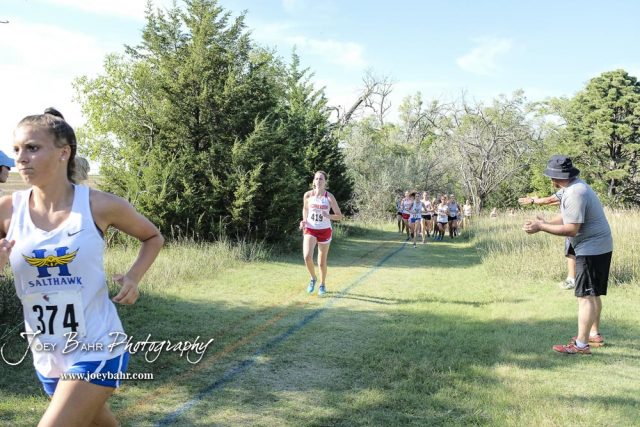 Katie Bahr (#419) of McPherson pursues Jacqeline Lewton (#374) of Hutchison. The Great Bend Cross Country Invitational was held at Lake Barton near Great Bend, Kansas on August 30, 2018. (Photo: Joey Bahr, www.joeybahr.com)undefined