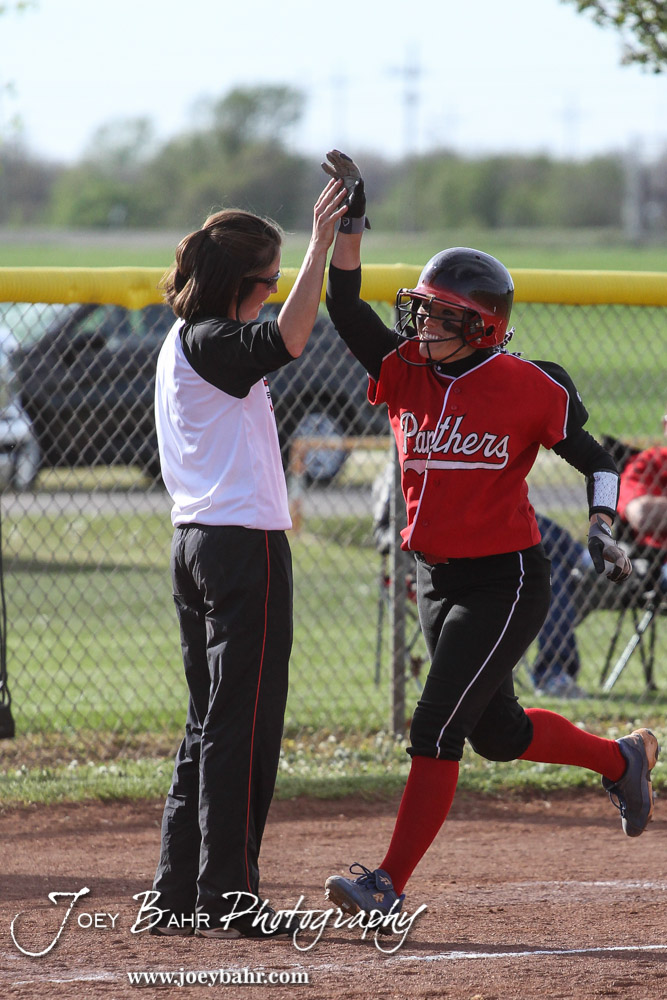 Great Bend Lady Panther Head Coach Carrie Minton congratulates Great Bend Lady Panther Dakota Sanders (#34) on hitting a home run during the Great Bend Lady Panthers versus Hays Lady Indians Softball game with Great Bend winning 14 to 3 at Veteran’s Memorial Park West Field in Great Bend, Kansas on May 2, 2014. (Photo: Joey Bahr, www.joeybahr.com)