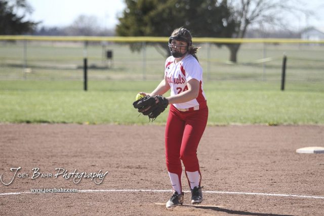 Hoisington Lady Cardinal Taylor Boxberger (#24) winds up to deliver a pitch in the top of the third inning. The Hoisington Lady Cardinals defeated the Halstead Lady Dragons by a score of 12 to 2 in six innings at Logan Field in Hoisington, Kansas on April 27, 2018. (Photo: Joey Bahr, www.joeybahr.com)undefined