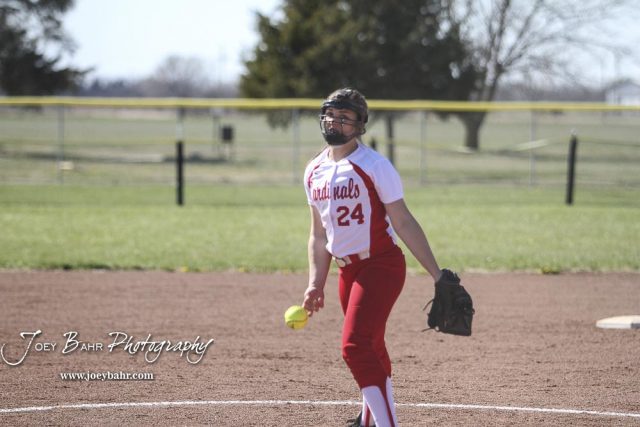 Hoisington Lady Cardinal Taylor Boxberger (#24) delivers a pitch in the top of the third inning. The Hoisington Lady Cardinals defeated the Halstead Lady Dragons by a score of 12 to 2 in six innings at Logan Field in Hoisington, Kansas on April 27, 2018. (Photo: Joey Bahr, www.joeybahr.com)undefined