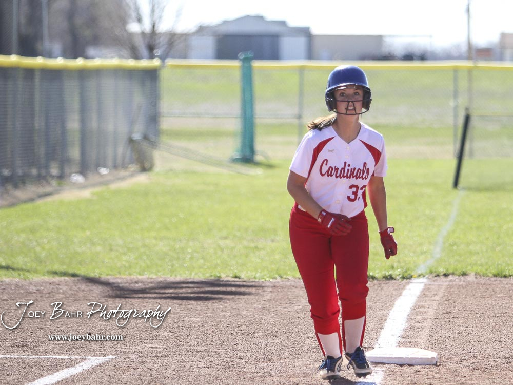 Hoisington Lady Cardinal Trinity Dolezal (#33) gets a lead off from third base in the bottom of the third inning. The Hoisington Lady Cardinals defeated the Halstead Lady Dragons by a score of 12 to 2 in six innings at Logan Field in Hoisington, Kansas on April 27, 2018. (Photo: Joey Bahr, www.joeybahr.com)undefined