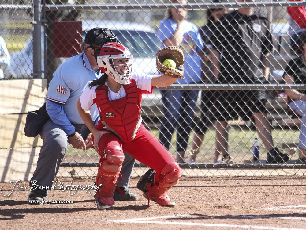 Hoisington Lady Cardinal Trinity Dolezal (#33) catches a pitch in the top of the fourth inning. The Hoisington Lady Cardinals defeated the Halstead Lady Dragons by a score of 12 to 2 in six innings at Logan Field in Hoisington, Kansas on April 27, 2018. (Photo: Joey Bahr, www.joeybahr.com)undefined
