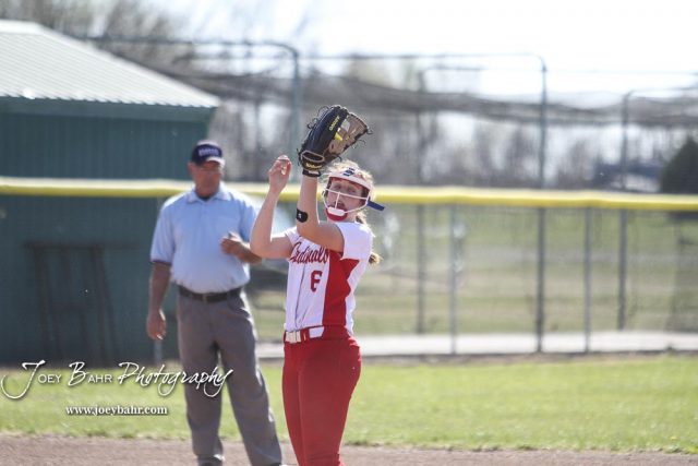 Hoisington Lady Cardinal Brooke Reif (#6) catches a fly ball in the infield during the top of the fourth inning. The Hoisington Lady Cardinals defeated the Halstead Lady Dragons by a score of 12 to 2 in six innings at Logan Field in Hoisington, Kansas on April 27, 2018. (Photo: Joey Bahr, www.joeybahr.com)undefined