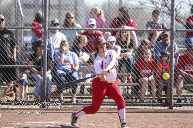 Hoisington Lady Cardinal Brooke Bachar (#18) swings at a ball in the bottom of the fourth inning. The Hoisington Lady Cardinals defeated the Halstead Lady Dragons by a score of 12 to 2 in six innings at Logan Field in Hoisington, Kansas on April 27, 2018. (Photo: Joey Bahr, www.joeybahr.com)undefined