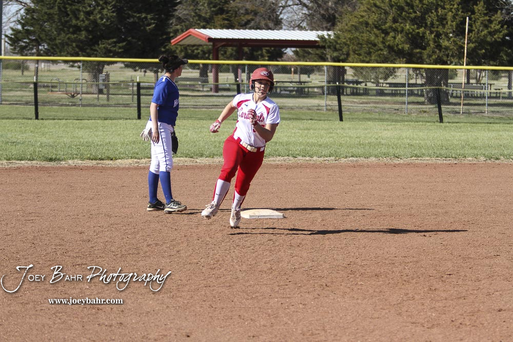 Hoisington Lady Cardinal Jenna Urban (#27) rounds second base on her way to third to lead off the bottom of the fifth inning. The Hoisington Lady Cardinals defeated the Halstead Lady Dragons by a score of 12 to 2 in six innings at Logan Field in Hoisington, Kansas on April 27, 2018. (Photo: Joey Bahr, www.joeybahr.com)undefined