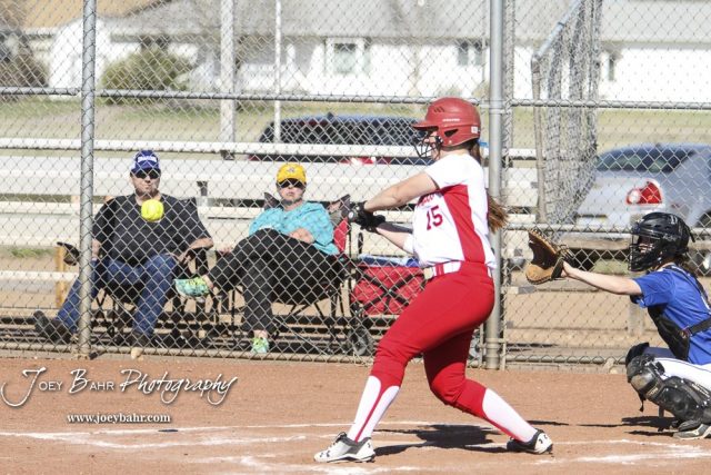Hoisington Lady Cardinal Brooke Steinert (#15) starts to swing at a pitch in the top of the fifth inning. The Hoisington Lady Cardinals defeated the Halstead Lady Dragons by a score of 12 to 2 in six innings at Logan Field in Hoisington, Kansas on April 27, 2018. (Photo: Joey Bahr, www.joeybahr.com)undefined